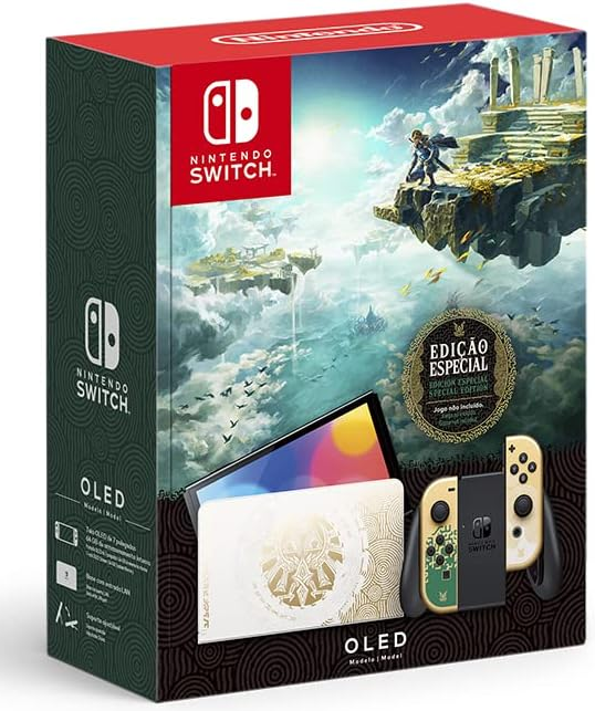 NINTENDO SWITCH OLED ZELDA TEARS OF THE KINGDOM: Conheça o novo membro vibrante da família Nintendo Switch Jogue em casa na TV ou em qualquer lugar com uma tela OLED vibrante de 7 polegadas com o console Nintendo Switch – Modelo OLED. Além de uma nova tela com cores vivas e contraste nítido, o Nintendo Switch – Modelo OLED inclui um amplo acessório de suporte ajustável que permite ângulos de visualização mais confortáveis, uma base com porta para cabo LAN para o modo TV (cabo LAN vendido separadamente), 64 GB de armazenamento interno* e áudio aprimorado nos modos portátil e semiportátil usando os alto-falantes do console. · Tela OLED de 7 polegadas - desfrute de cores vivas e contraste nítido com uma tela que acentua as cores · Amplo acessório de suporte ajustável - posicione como desejar o amplo e ajustável acessório de suporte do console para uma visualização confortável no modo semiportátil · Porta para cabo LAN - use a porta LAN da base ao jogar no modo TV para conectar-se à rede via cabo · 64 GB de armazenamento interno - salve jogos em seu console com 64 GB de armazenamento interno* · Áudio aprimorado - curta o som aprimorado dos alto-falantes integrados do console ao jogar nos modos portátil e semiportátil · Compatível com todos os controles Joy-ConTM e softwares** Nintendo Switch *Uma parte do armazenamento interno é reservada para uso do console. Os jogadores podem expandir o espaço de armazenamento facilmente usando cartões microSDXC de até 2 TB (vendidos separadamente). **Em certos softwares, a experiência de jogo pode ser diferente devido às novas funcionalidades do console, como o tamanho de tela maior.
