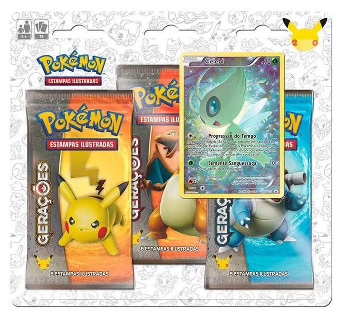 A linha Pokémon TCG Gerações (Generations) mistura cartas clássicas e exclusivas em uma das melhores expansões lançadas até hoje, neste super pacote além de 3 boosters com 6 cartas em cada um, você também leva o poderoso Celebi (XY111).